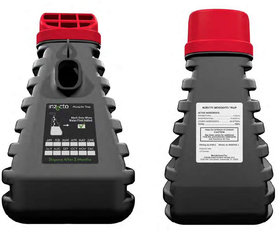 Unutrašnjost INZECTO klopke za komarce je prekrivena postojanim premazom koji sadrži insekticid sa adulticidnim i larvicidnim delovanjem. Klopka predstavlja idealno mesto za polaganje jaja komaraca, a ženke komaraca privlači svojim oblikom, bojom, vlažnošću i mirisom. Klopka suzbija kako odrasle ženke komaraca koje uđu u nju da polože jaja, tako i sve larve komaraca koje su se eventualno mogle razviti u njoj. INZECTO klopka za komarce je efikasna 3 meseca nakon otvaranja pakovanja i postavljanja.
